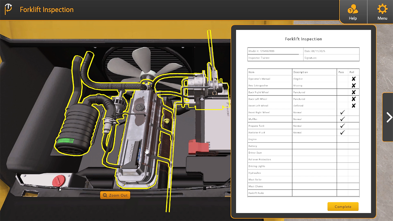 The Forklift Inspection course provides learners with a hands-on, interactive simulation for conducting a proper pre-operation inspection of a forklift. Using a guided checklist, participants will assess key safety components, identify potential defects, and assign appropriate conditions to each part. This transitionalREALITY™ module builds familiarity with critical inspection protocols while reinforcing the importance of hazard awareness before operating powered industrial trucks.