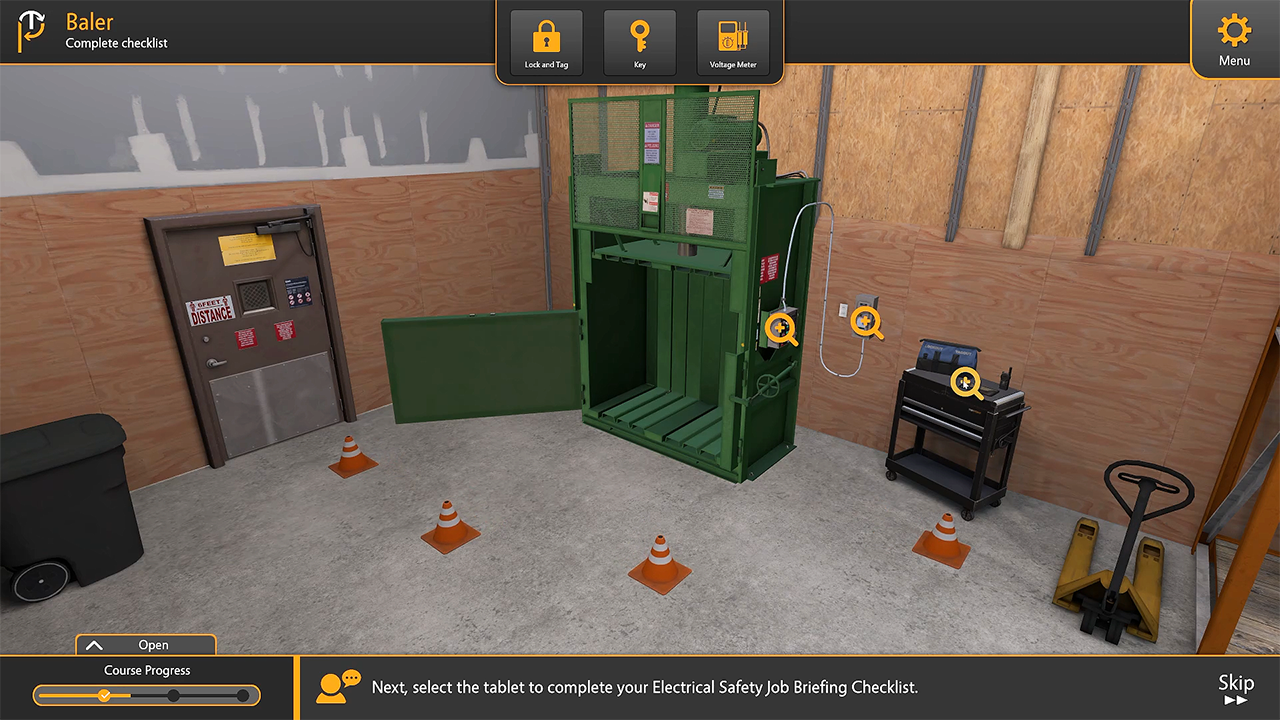 The Hazardous Energy LOTO: Baler course offers immersive, scenario-based training focused on the safe de-energization of baling equipment. Through transitionalREALITY™, learners will engage in a complete lockout/tagout (LOTO) procedure, covering equipment assessment, PPE selection, and the controlled isolation of hazardous energy sources. A final knowledge check ensures learners can confidently apply each step in real-world maintenance and servicing scenarios.